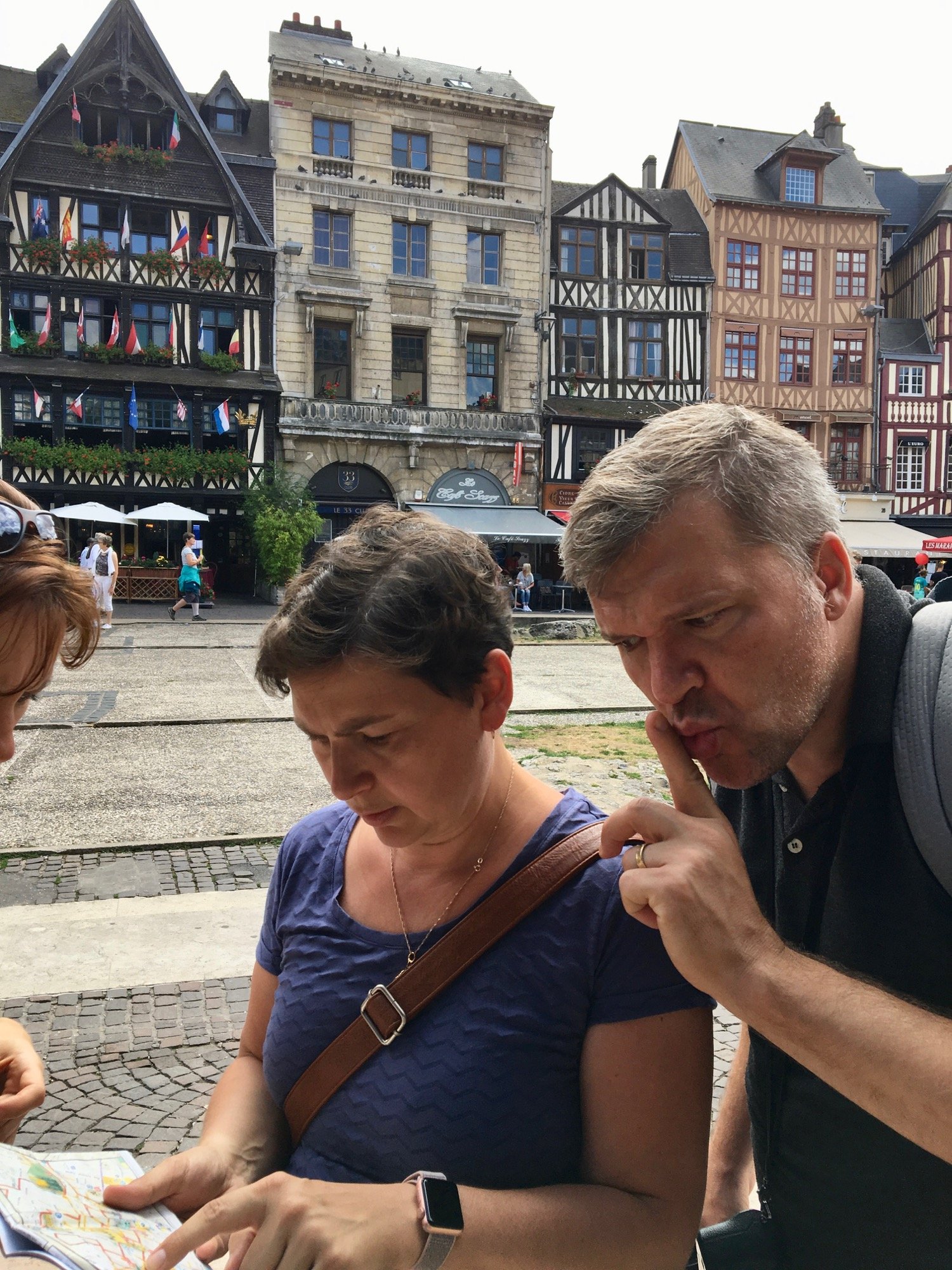 Unser erstes touristisches Highlight sollte Rouen werden. Der Parkplatz den wir vorab recherchiert hatten bot uns reichlich Platz und so konnten wir das historische Zentrum erkunden. Es wechselten moderne Bauten mit schön restaurierten, historischen Gebäuden, imposanten Kirchen und der alles überragenden Kathedrale. Aber auch die Tagesaufgabe konnte hier erledigt werden, je Wohnwagen eine lokale SIM-Karte. Damit sollten nun die Verbindungsprobleme mit der Welt vorerst erledigt sein. Jeweils 100 GB sollten uns für die beiden Wochen gerade so reichen. Da müssen wir uns eben mal etwas einschränken. 🤷♂️