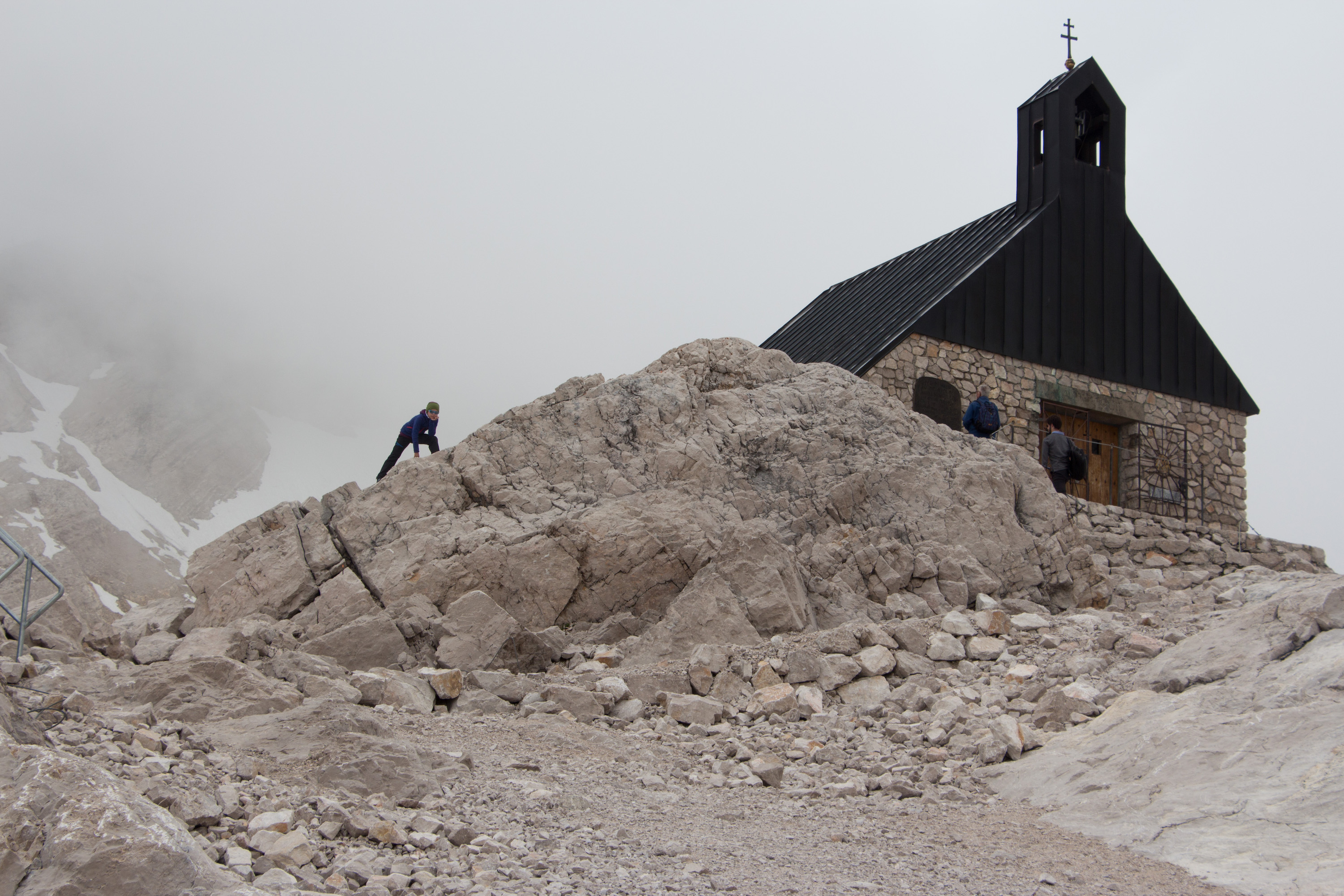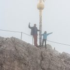 Heute hat es uns hoch hinauf gezogen. Bei strahlendem Sonnenschein (im Tal) machten wir uns auf den Weg zur Zugspitze. Dort mussten wir leider feststellen, dass der Gipfel irgendwie sein eigenes Wetter hat und sich in einer Wolke versteckt hielt. Davon ließen wir uns aber nicht abschrecken, und stellten uns in die Schlange vor der Seilbahn. Irgendwann war es dann so weit und es ging aufwärts für uns. Oben angekommen sind Josi und ich zunächst zum Gipfel aufgestiegen.