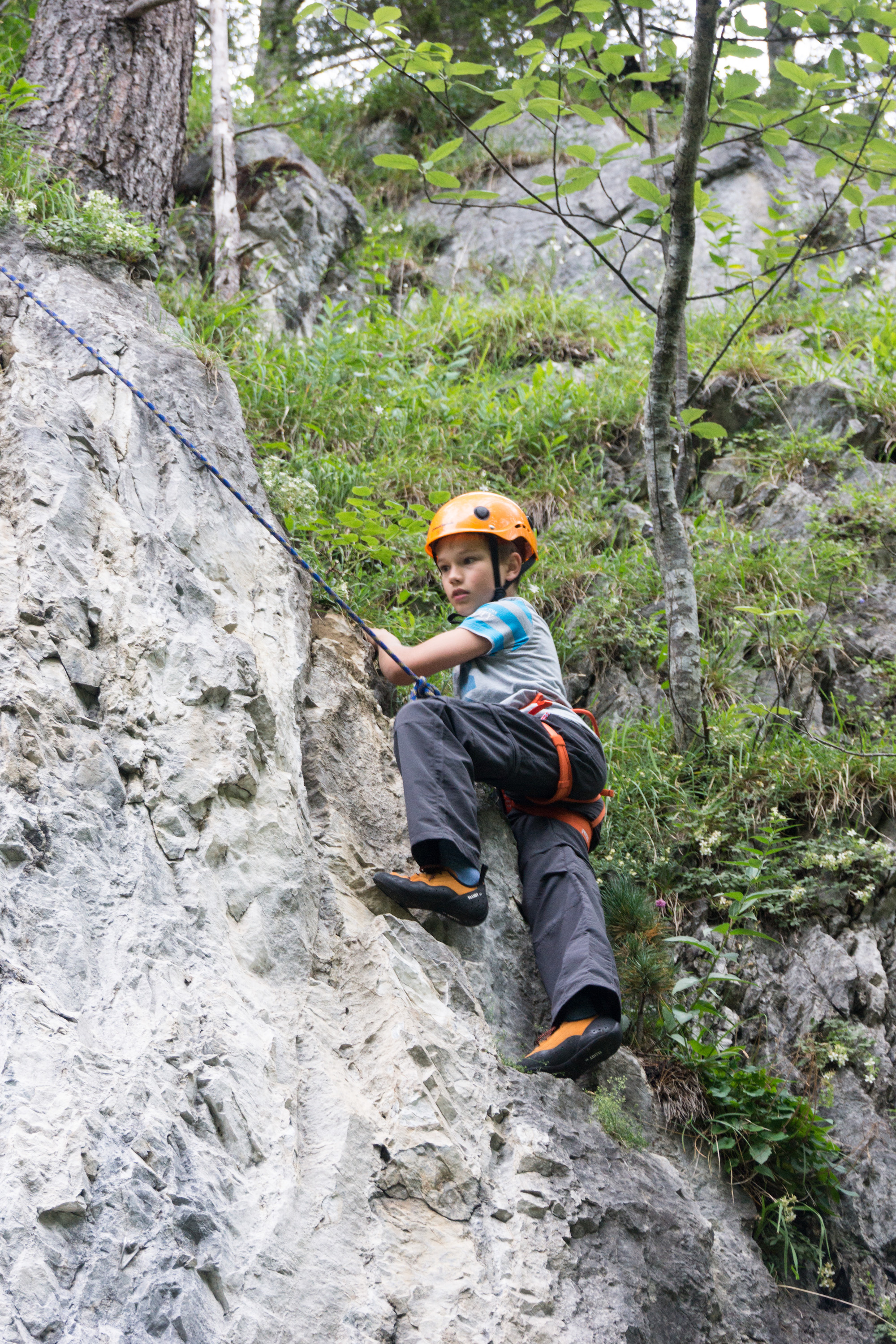 Nach dem wir am frühen Abend wieder in unserer Ferienwohnung angekommen waren, sind die Papas mit den Kindern zur nahegelegenen Kletterwand gelaufen. Und so kam es dann zum „Ersten Kontakt“ mit dem Fels.😀 Der Reihe nach kletterten die Großen und auch der Kleinste die Wand hinauf.