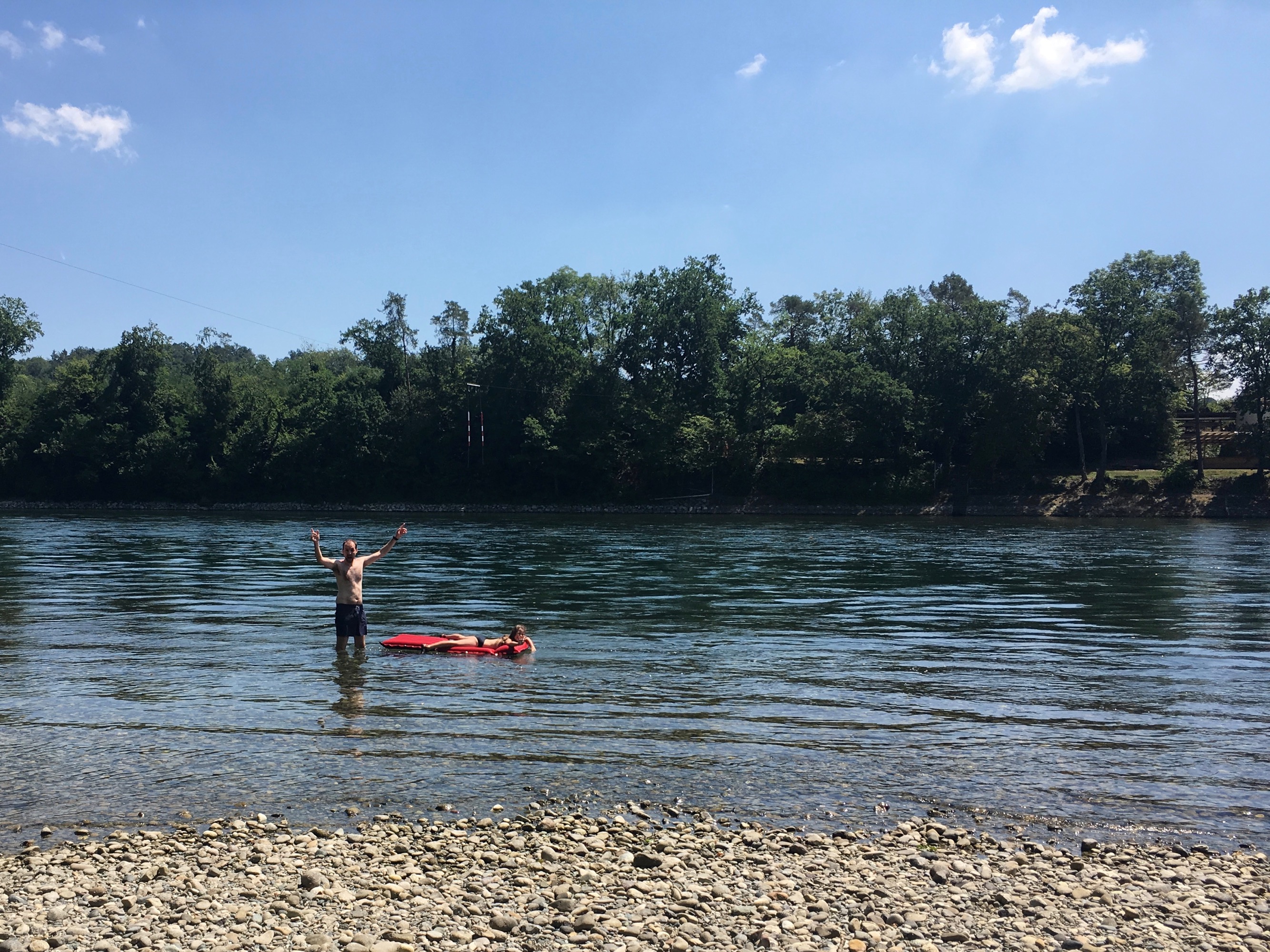 Heute war es hier an der Schweizer Grenze mal wieder richtig heiß. Somit war Baden im Rhein die beste Möglichkeit den Tag rumzukriegen. Der Volkssport hier ist flussaufwärts mit oder ohne Schwimmhilfe ins Wasser zu springen, sich treiben zu lassen und weiter flussabwärts wieder an Land zu klettern. Das haben wir heute auch so gemacht, man will ja nicht unangenehm aufgefallen!😜 Was für ein Spaß! Den Tag haben wir dann gemütlich mit Jessica und den Jungs ausklingen lassen.